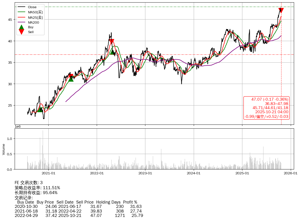 | 30 | ★FE | $47.08(-0.16 -0.34% 2025-10-21 15:59) | 📉跌破 MA5 均线 📉回撤 2025-10-16 -1.28% (5天) 46.80(2025-10-16) → 47.68(2025-10-15) (-1.85%) | +111.51% | +95.64% | +15.87% | 3 | 偏空/0.52/-0.03 | 2020-07-27~2025-10-21 |