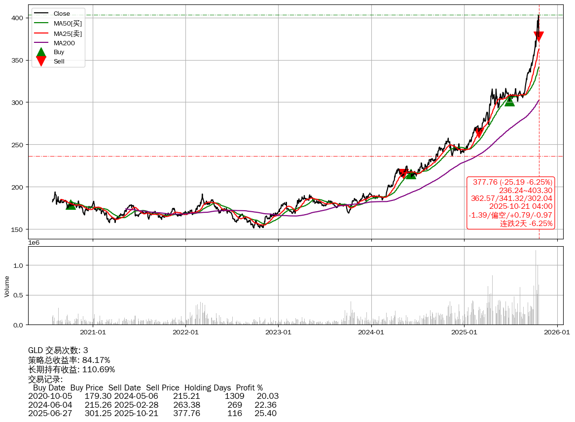 | 35 | ★GLD | $377.89(-25.11 -6.23% 2025-10-21 15:59) | 📉跌破 MA5/10 均线 📉连跌2天 -6.25% 📉回撤 2025-10-21 -6.25% (0天) 377.76(2025-10-21) → 402.95(2025-10-20) (-6.25%) | +84.17% | +110.69% | -26.51% | 3 | 偏空/0.79/-0.97 | 2020-07-27~2025-10-21 |