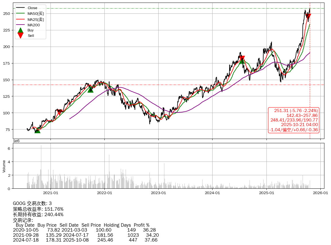 | 20 | ★GOOG | $251.32(-5.76 -2.24% 2025-10-21 15:59) | 📉跌破 MA5 均线 📉回撤 2025-10-21 -2.24% (0天) 251.31(2025-10-21) → 257.07(2025-10-20) (-2.24%) | +151.76% | +240.44% | -88.67% | 3 | 偏空/0.66/-0.36 | 2020-07-27~2025-10-21 |