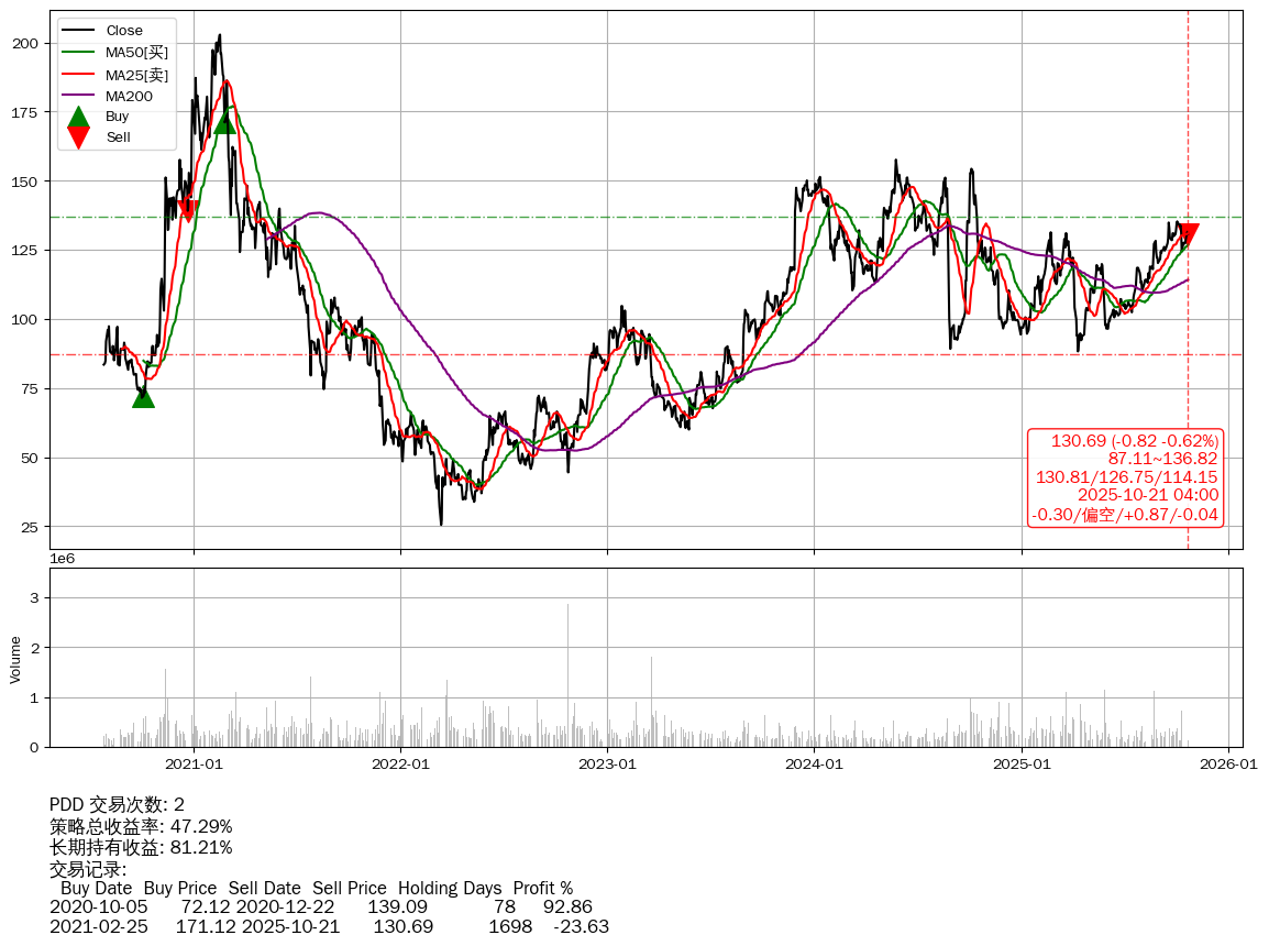 | 42 | ★PDD | $130.68(-0.84 -0.64% 2025-10-21 15:59) | 📉跌破 MA25 均线 📉回撤 2021-02-18 -35.56% (1705天) 25.53(2022-03-14) → 202.80(2021-02-17) (-87.41%) | +47.29% | +81.21% | -33.92% | 2 | 偏空/0.87/-0.04 | 2020-07-27~2025-10-21 |