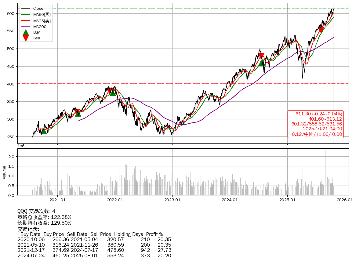 | 25 | ★QQQ | $611.41(-0.13 -0.02% 2025-10-21 15:59) | 📉回撤 2025-10-21 -0.04% (0天) 611.30(2025-10-21) → 611.54(2025-10-20) (-0.04%) | +122.38% | +129.50% | -7.12% | 4 | 中性/1.06/-0.00 | 2020-07-27~2025-10-21 |