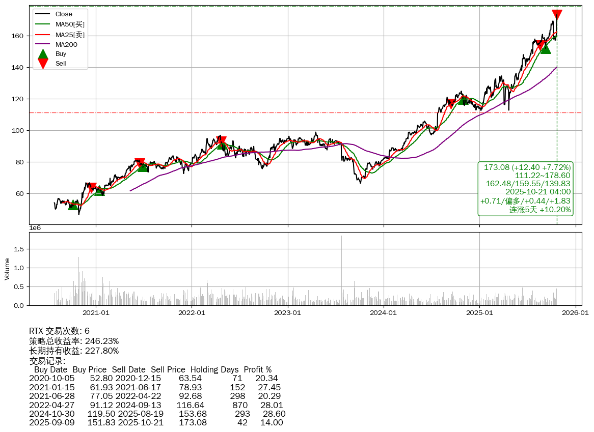 | 11 | ★RTX | $172.97(+12.30 +7.66% 2025-10-21 15:59) | 📈涨破 MA5/10/25 均线 📈涨破 52周高点 (178.60) 📈连涨5天 +10.20% | +246.23% | +227.80% | +18.43% | 6 | 偏多/0.44/1.83 | 2020-07-27~2025-10-21 |