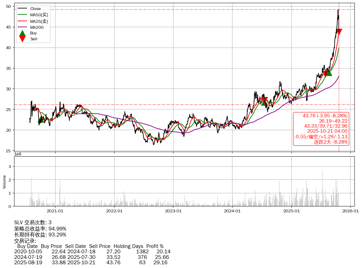 | 32 | ★SLV | $43.78(-3.92 -8.22% 2025-10-21 15:59) | 📉跌破 MA5/10 均线 📉连跌2天 -8.28% 📉回撤 2025-10-17 -11.00% (4天) 43.76(2025-10-21) → 49.17(2025-10-16) (-11.00%) | +94.99% | +93.29% | +1.70% | 3 | 偏空/1.29/-1.13 | 2020-07-27~2025-10-21 |