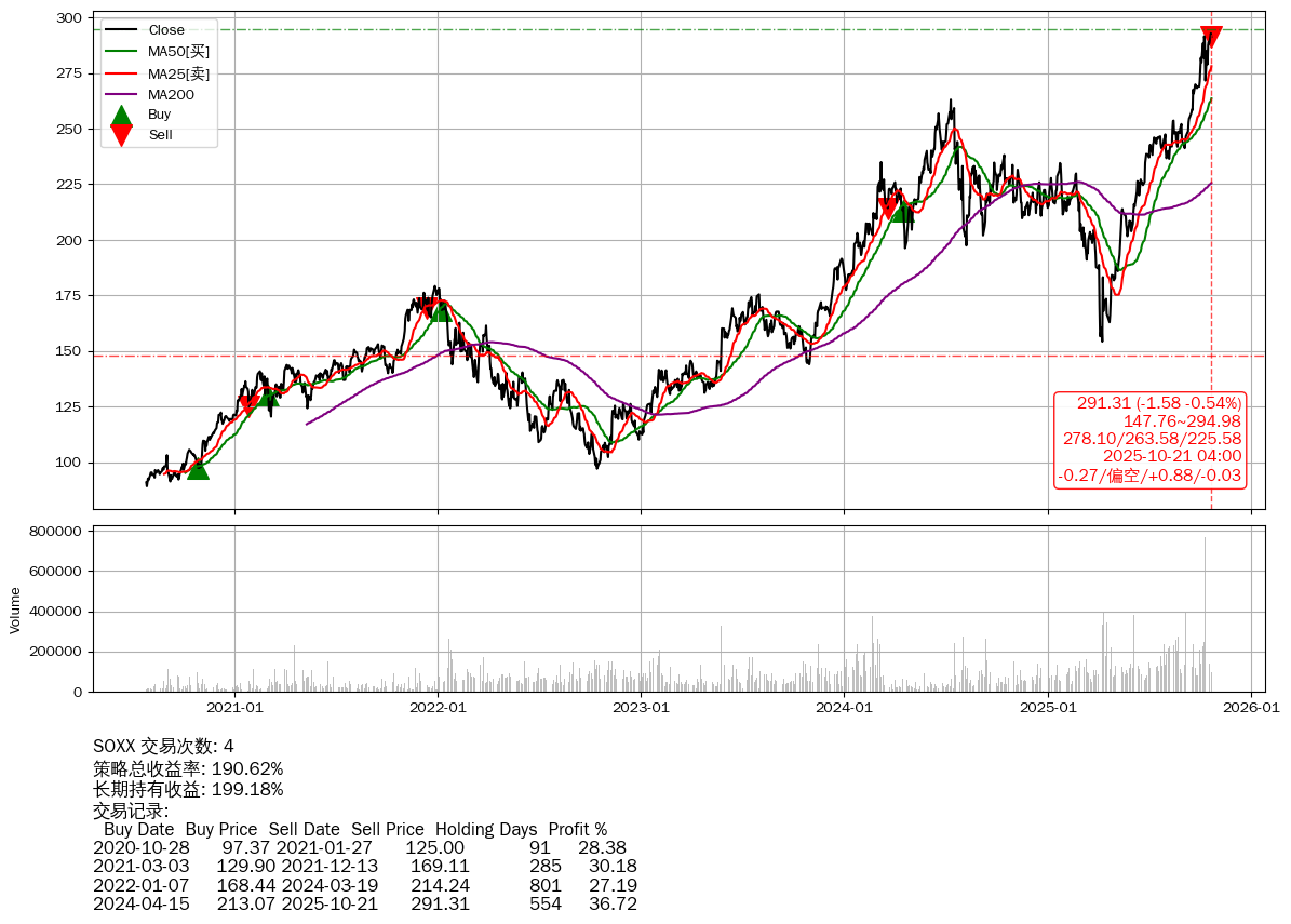 | 16 | ★SOXX | $291.35(-1.64 -0.56% 2025-10-21 15:59) | 📉回撤 2025-10-21 -0.54% (0天) 291.31(2025-10-21) → 292.89(2025-10-20) (-0.54%) | +190.62% | +199.18% | -8.56% | 4 | 偏空/0.88/-0.03 | 2020-07-27~2025-10-21 |