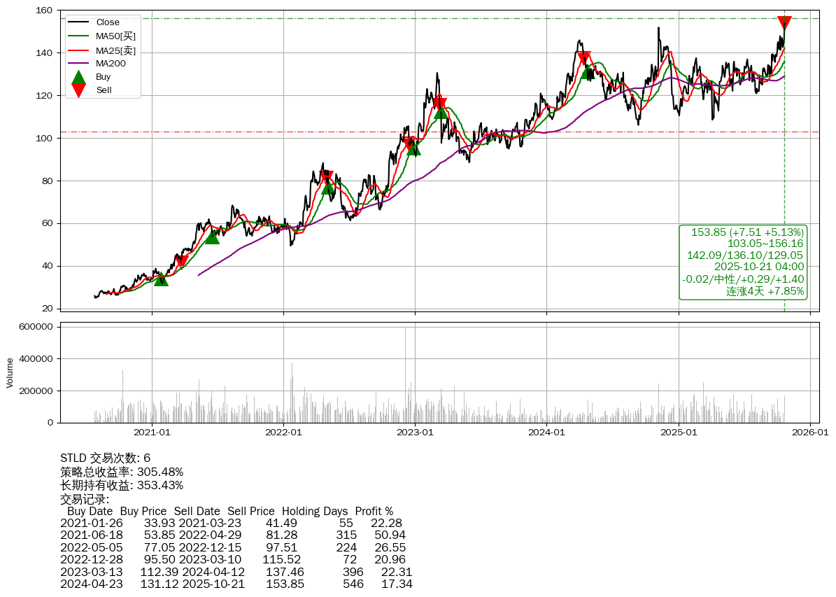 | 9 | ★STLD | $153.81(+7.40 +5.05% 2025-10-21 15:59) | 📈涨破 52周高点 (156.16) 📈连涨4天 +7.85% | +305.48% | +353.43% | -47.95% | 6 | 中性/0.29/1.40 | 2020-07-27~2025-10-21 |