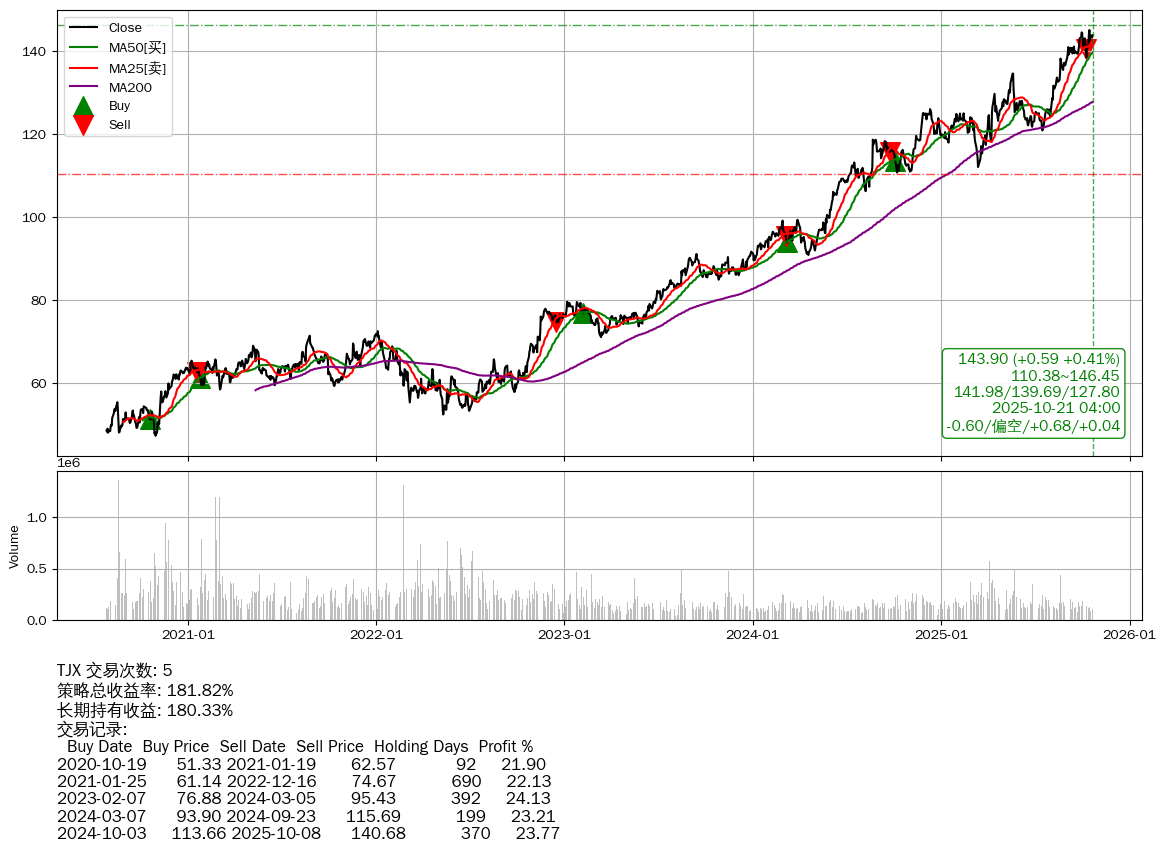 | 18 | ★TJX | $143.87(+0.54 +0.38% 2025-10-21 15:59) | 📈涨破 MA5 均线 📉回撤 2025-10-16 -0.86% (5天) 142.54(2025-10-16) → 145.14(2025-10-15) (-1.79%) | +181.82% | +180.33% | +1.48% | 5 | 偏空/0.68/0.04 | 2020-07-27~2025-10-21 |