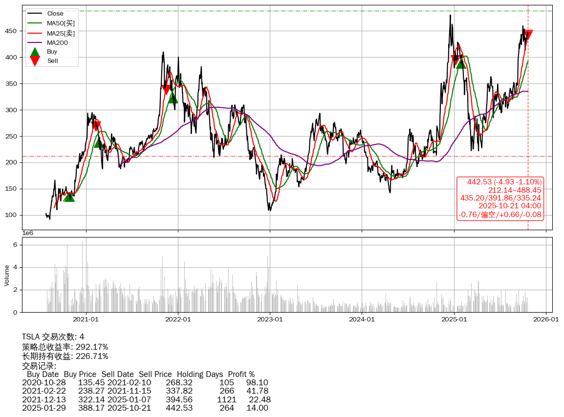| 10 | ★TSLA | $442.51(-4.84 -1.08% 2025-10-21 15:59) | 📉回撤 2024-12-18 -7.78% (306天) 221.89(2025-04-08) → 479.86(2024-12-17) (-53.76%) | +292.17% | +226.71% | +65.45% | 4 | 偏空/0.66/-0.08 | 2020-07-27~2025-10-21 |