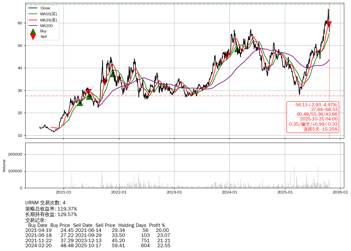 | 8 | ★URA | $49.92(-3.44 -6.45% 2025-10-21 15:59) | 📉跌破 MA25 均线 📉连跌2天 -6.50% 📉回撤 2025-10-16 -14.17% (5天) 49.93(2025-10-21) → 58.17(2025-10-15) (-14.17%) | +316.49% | +436.31% | -119.82% | 5 | 偏多/2.84/-0.55 | 2020-07-27~2025-10-21 |
