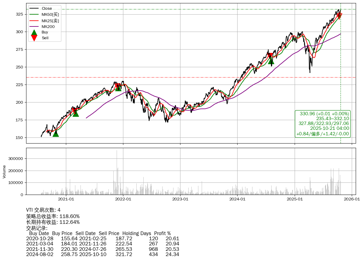 | 29 | ★VTI | $330.91(-0.01 -0.00% 2025-10-21 15:59) | 📉回撤 2025-10-09 -0.25% (12天) 321.72(2025-10-10) → 331.77(2025-10-08) (-3.03%) | +118.60% | +112.64% | +5.96% | 4 | 偏多/1.42/-0.00 | 2020-07-27~2025-10-21 |