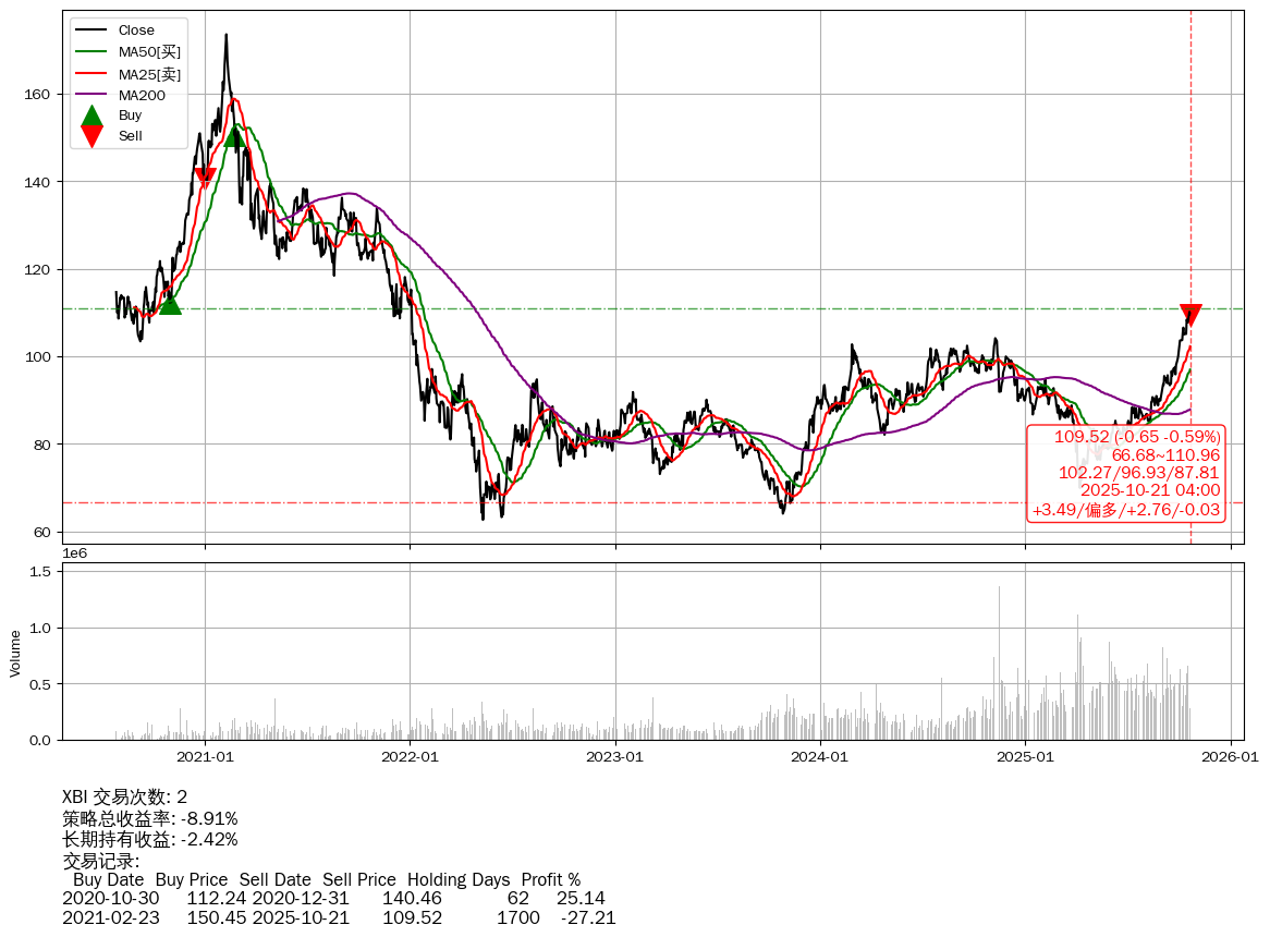 | 47 | ★XBI | $109.52(-0.63 -0.57% 2025-10-21 15:59) | 📉回撤 2021-02-09 -36.91% (1714天) 62.59(2022-05-11) → 173.59(2021-02-08) (-63.94%) | -8.91% | -2.42% | -6.49% | 2 | 偏多/2.76/-0.03 | 2020-07-27~2025-10-21 |