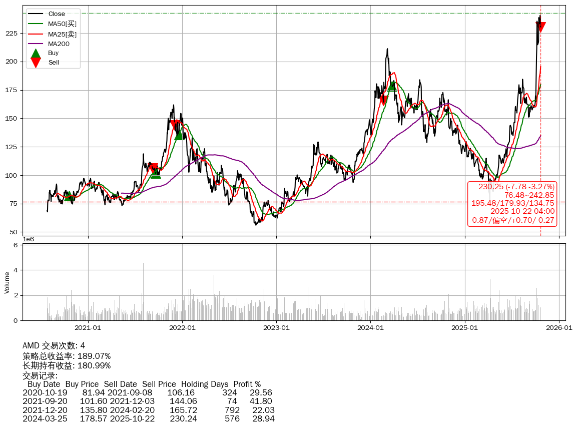 | 16 | ★AMD | $230.24(-7.83 -3.29% 2025-10-22 15:59) | 📉跌破 MA5 均线 📉回撤 2025-10-21 -4.27% (1天) 230.25(2025-10-22) → 240.52(2025-10-20) (-4.27%) | +189.07% | +180.99% | +8.08% | 4 | 偏空/0.7/-0.27 | 2020-07-27~2025-10-22 |