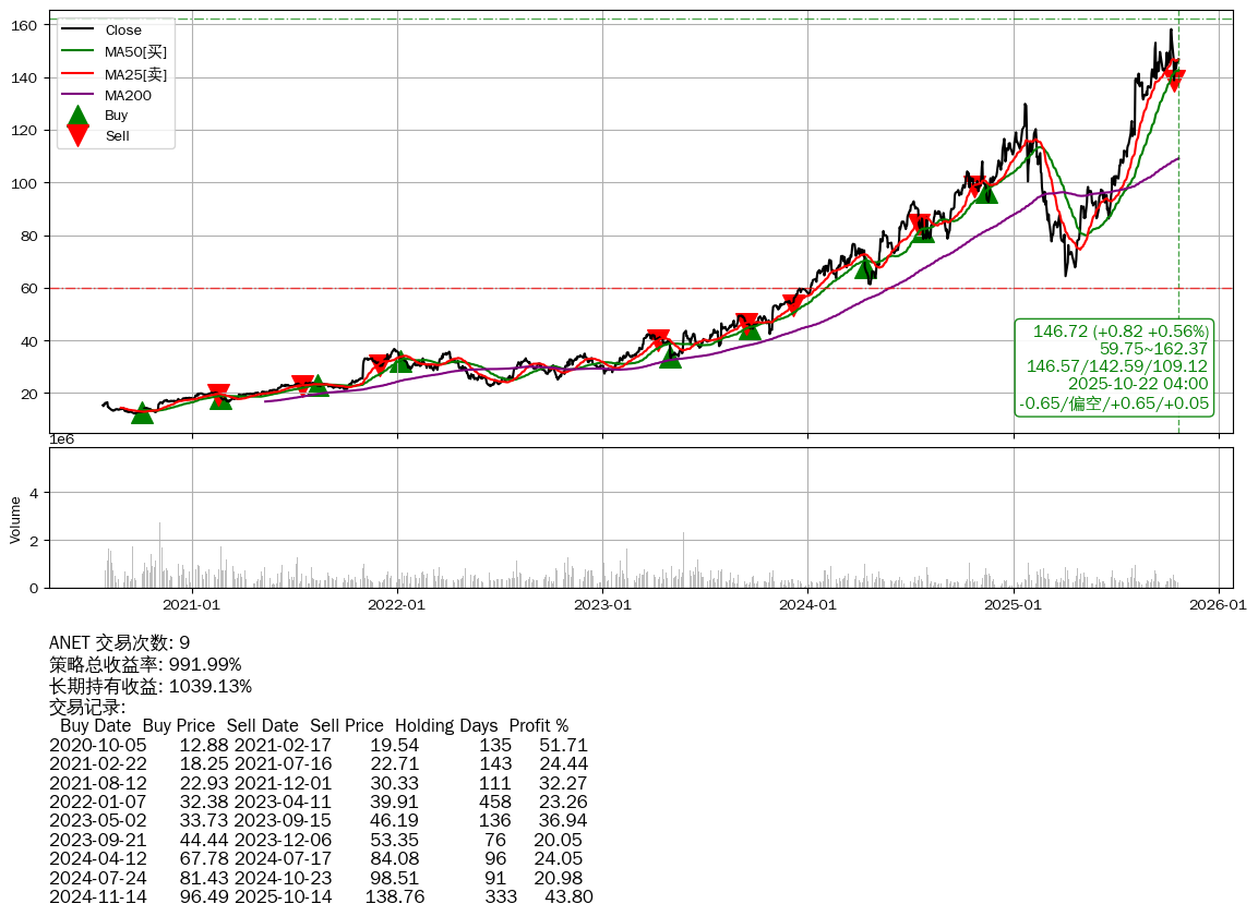 | 2 | ★ANET | $146.64(+0.75 +0.51% 2025-10-22 15:59) | 📈涨破 MA25 均线 📉回撤 2025-10-10 -7.23% (12天) 138.75(2025-10-14) → 158.16(2025-10-09) (-12.27%) | +991.99% | +1039.13% | -47.14% | 9 | 偏空/0.65/0.05 | 2020-07-27~2025-10-22 |