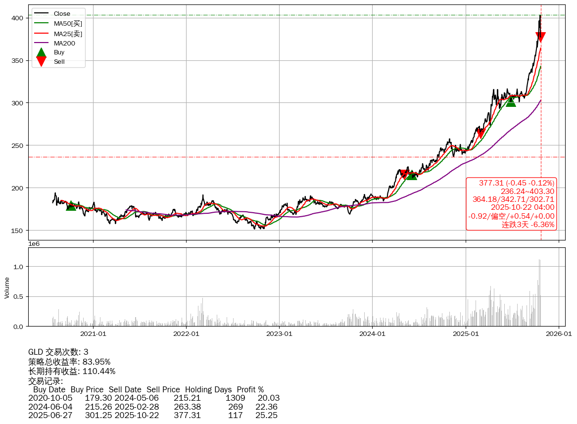 | 33 | ★GLD | $377.34(-0.55 -0.15% 2025-10-22 15:59) | 📉连跌3天 -6.36% 📉回撤 2025-10-21 -6.36% (1天) 377.31(2025-10-22) → 402.95(2025-10-20) (-6.36%) | +83.95% | +110.44% | -26.48% | 3 | 偏空/0.54/0.00 | 2020-07-27~2025-10-22 |