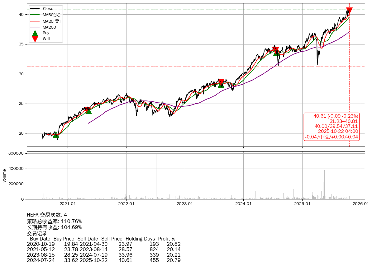 | 30 | ★HEFA | $40.61(-0.06 -0.15% 2025-10-22 15:59) | 📉回撤 2025-10-21 -0.45% (1天) 40.61(2025-10-22) → 40.80(2025-10-20) (-0.45%) | +110.76% | +104.69% | +6.08% | 4 | 中性/0/-0.04 | 2020-07-27~2025-10-22 |
