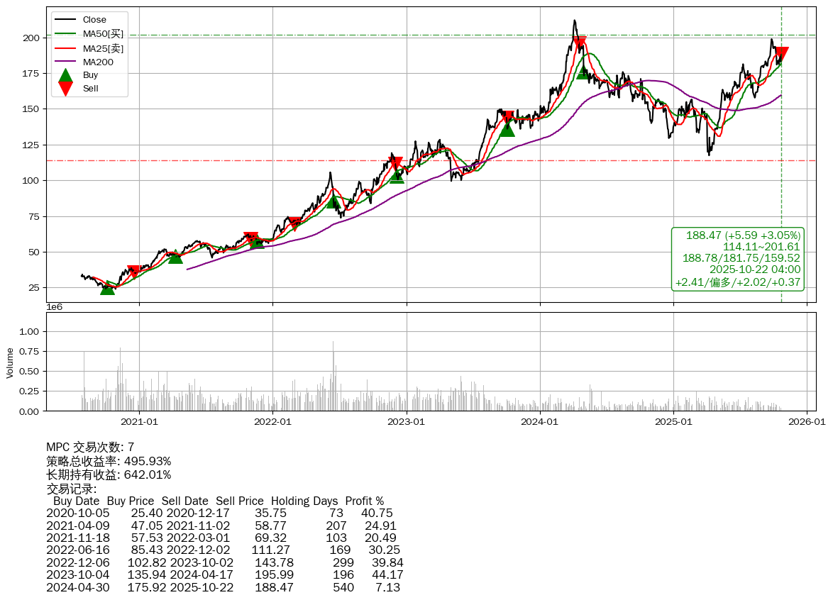 | 5 | MPC | $188.56(+5.70 +3.12% 2025-10-22 15:59) | 📈涨破 MA5/10 均线 📉回撤 2024-04-08 -11.09% (562天) 117.33(2025-04-08) → 211.99(2024-04-05) (-44.65%) | +495.93% | +642.01% | -146.08% | 7 | 偏多/2.02/0.37 | 2020-07-27~2025-10-22 |