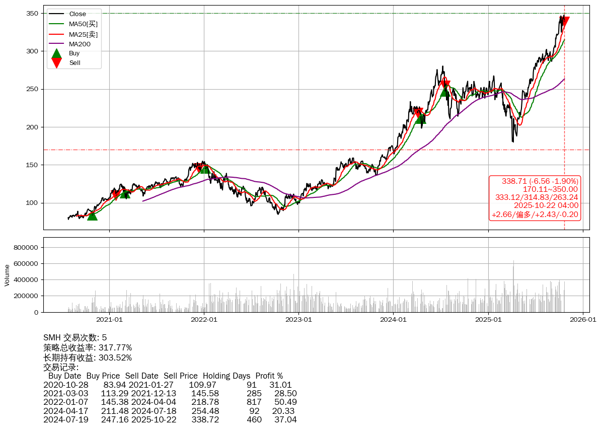 | 7 | ★SMH | $338.68(-6.64 -1.92% 2025-10-22 15:59) | 📉跌破 MA5/10 均线 📉回撤 2025-10-21 -2.47% (1天) 338.71(2025-10-22) → 347.28(2025-10-20) (-2.47%) | +317.77% | +303.52% | +14.25% | 5 | 偏多/2.43/-0.20 | 2020-07-27~2025-10-22 |