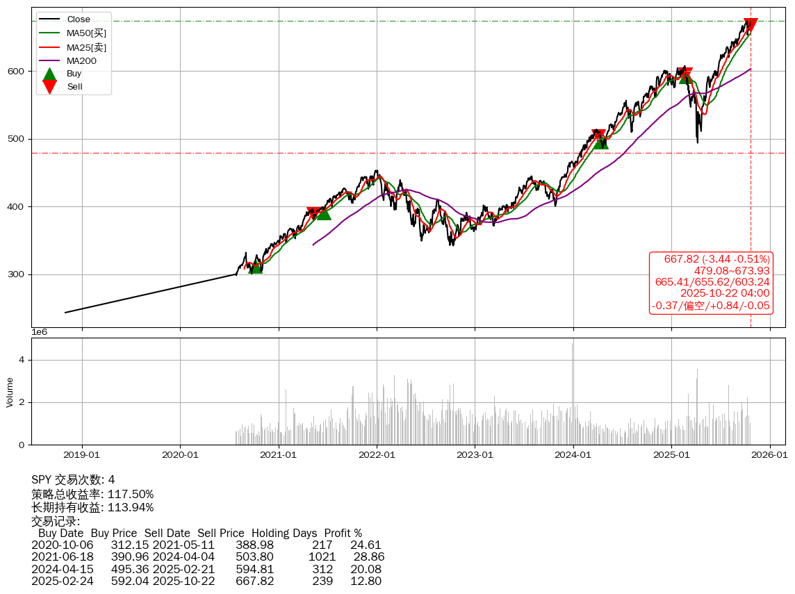 | 29 | ★SPY | $667.81(-3.43 -0.51% 2025-10-22 15:59) | 📉回撤 2025-10-09 -0.78% (13天) 653.27(2025-10-10) → 673.06(2025-10-08) (-2.94%) | +117.50% | +113.94% | +3.55% | 4 | 偏空/0.84/-0.05 | 2018-11-01~2025-10-22 |
