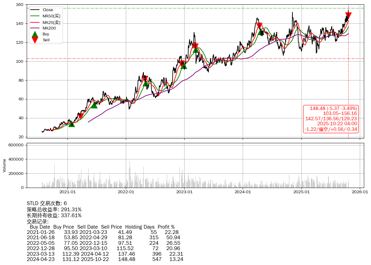 | 9 | ★STLD | $148.56(-5.25 -3.41% 2025-10-22 15:59) | 📉回撤 2025-10-22 -3.49% (0天) 148.48(2025-10-22) → 153.85(2025-10-21) (-3.49%) | +291.31% | +337.61% | -46.29% | 6 | 偏空/0.56/-0.34 | 2020-07-27~2025-10-22 |