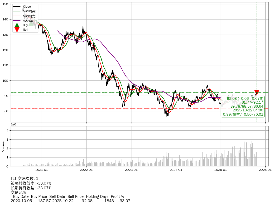 | 49 | ★TLT | $92.07(+0.06 +0.07% 2025-10-22 15:59) | 📉回撤 2020-08-05 -37.62% (1904天) 76.23(2023-10-19) → 147.61(2020-08-04) (-48.36%) | -33.07% | -33.07% | +0.00% | 1 | 偏空/0.5/0.01 | 2020-07-27~2025-10-22 |