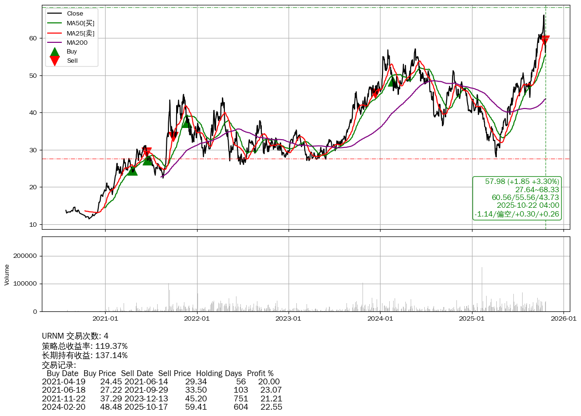 | 26 | URNM | $58.10(+1.89 +3.36% 2025-10-22 15:59) | 📉回撤 2025-10-16 -12.46% (6天) 56.13(2025-10-21) → 66.23(2025-10-15) (-15.25%) | +119.37% | +137.14% | -17.76% | 4 | 偏空/0.3/0.26 | 2020-07-28~2025-10-22 |