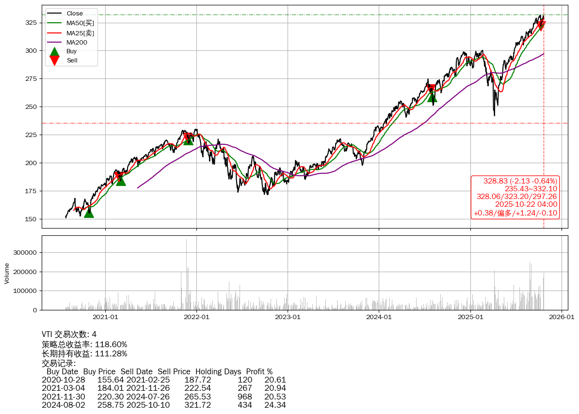 | 27 | ★VTI | $328.86(-2.05 -0.62% 2025-10-22 15:59) | 📉回撤 2025-10-09 -0.89% (13天) 321.72(2025-10-10) → 331.77(2025-10-08) (-3.03%) | +118.60% | +111.28% | +7.33% | 4 | 偏多/1.24/-0.10 | 2020-07-27~2025-10-22 |