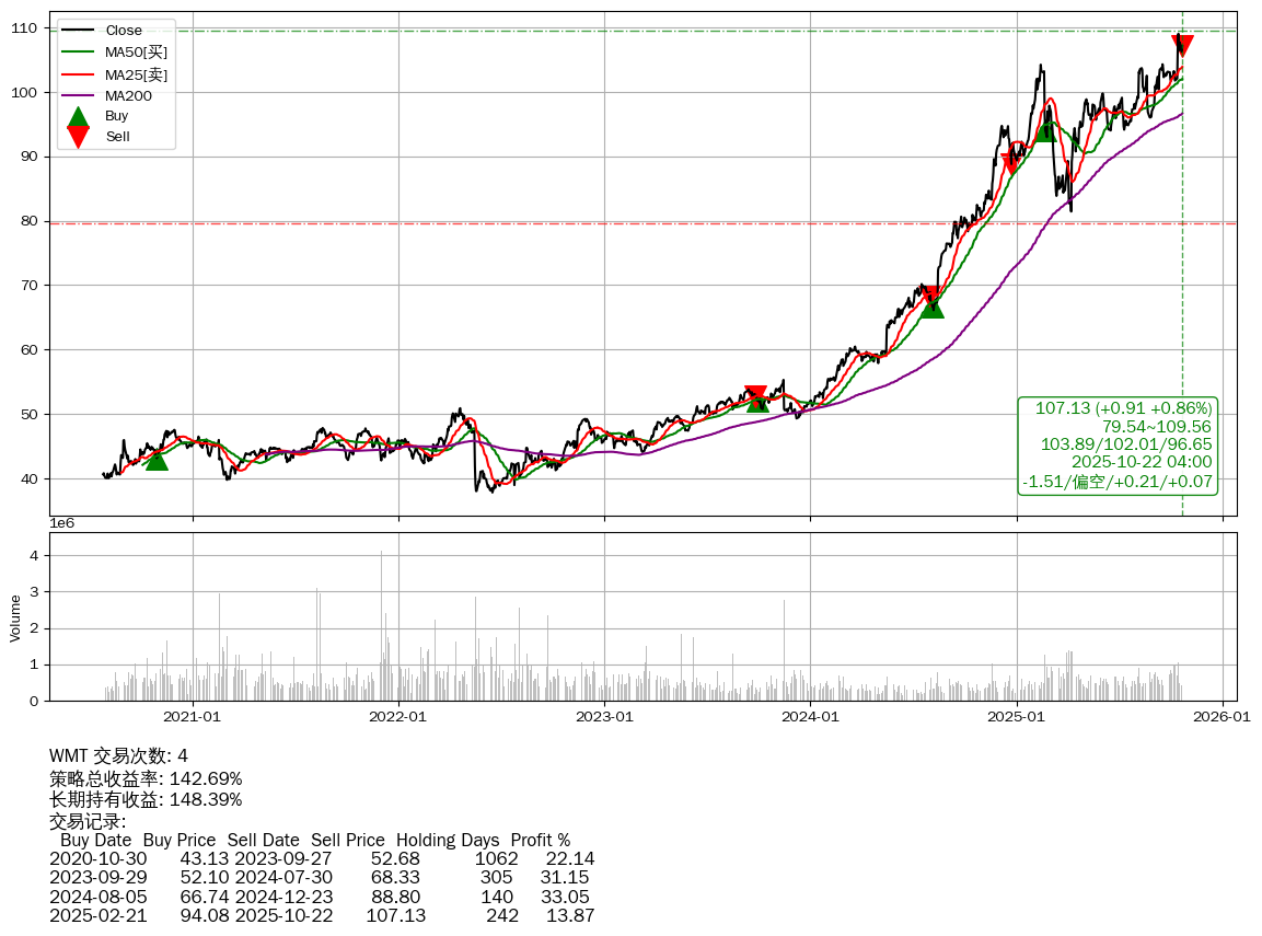 | 22 | ★WMT | $107.14(+0.92 +0.87% 2025-10-22 15:59) | 📈涨破 MA5 均线 📉回撤 2025-10-16 -1.74% (6天) 106.22(2025-10-21) → 109.03(2025-10-15) (-2.58%) | +142.69% | +148.39% | -5.70% | 4 | 偏空/0.21/0.07 | 2020-07-27~2025-10-22 |