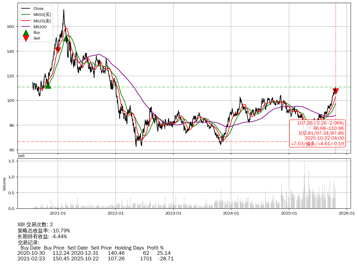| 46 | ★XBI | $107.29(-2.23 -2.04% 2025-10-22 15:59) | 📉跌破 MA5/10 均线 📉回撤 2021-02-09 -38.21% (1715天) 62.59(2022-05-11) → 173.59(2021-02-08) (-63.94%) | -10.79% | -4.44% | -6.35% | 2 | 偏多/4.61/-0.19 | 2020-07-27~2025-10-22 |