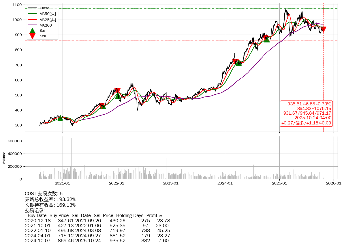| 16 | ★COST | $932.12(-10.17 -1.08% 2025-10-24 15:59) | 📉跌破 MA5/10 均线 📉回撤 2025-02-14 -12.85% (251天) 888.74(2025-03-13) → 1073.41(2025-02-13) (-17.20%) | +193.32% | +169.13% | +24.19% | 5 | 偏多/1.18/-0.09 | 2020-07-27~2025-10-24 |