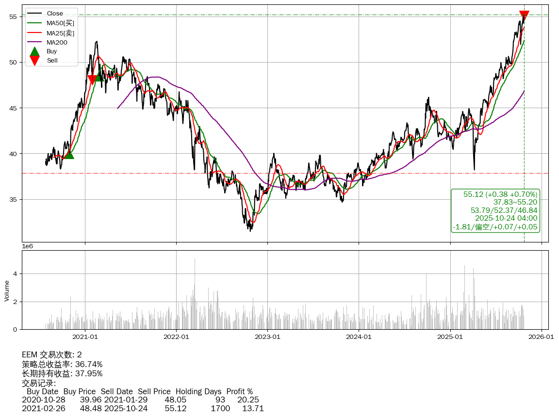 | 40 | ★EEM | $55.10(+0.36 +0.66% 2025-10-24 15:59) | 📈涨破 52周高点 (55.20) | +36.74% | +37.95% | -1.21% | 2 | 偏空/0.07/0.05 | 2020-07-27~2025-10-24 |