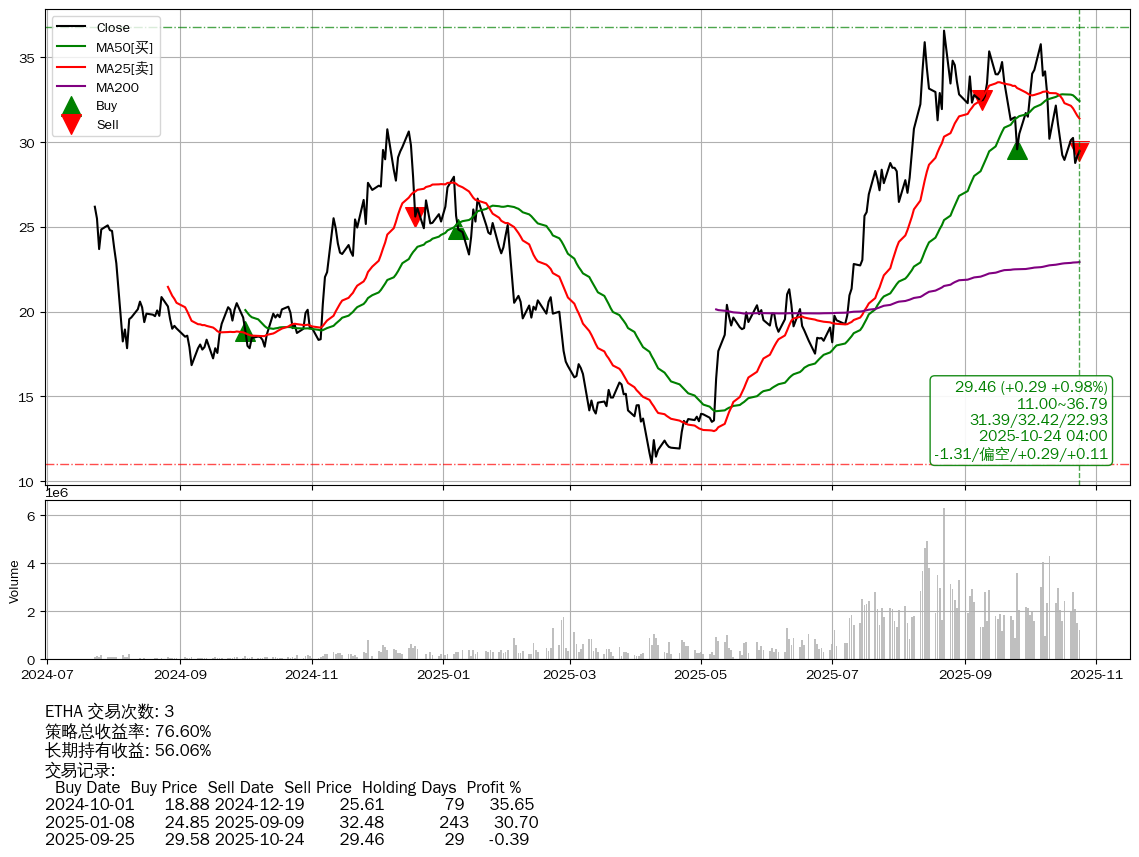 | 33 | ★ETHA | $29.69(+0.51 +1.75% 2025-10-24 15:59) | 📉回撤 2025-08-25 -19.45% (60天) 28.77(2025-10-22) → 36.58(2025-08-22) (-21.35%) | +76.60% | +56.06% | +20.54% | 3 | 偏空/0.29/0.11 | 2024-07-23~2025-10-24 |