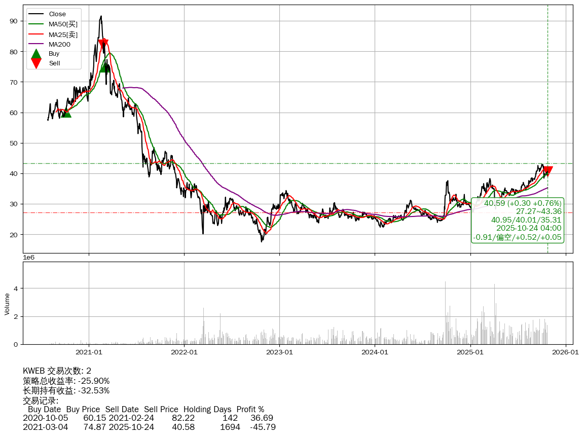 | 44 | ★KWEB | $40.56(+0.30 +0.75% 2025-10-24 15:59) | 📉回撤 2021-02-18 -55.69% (1708天) 17.53(2022-10-24) → 91.60(2021-02-17) (-80.86%) | -25.90% | -32.53% | +6.63% | 2 | 偏空/0.52/0.05 | 2020-07-27~2025-10-24 |