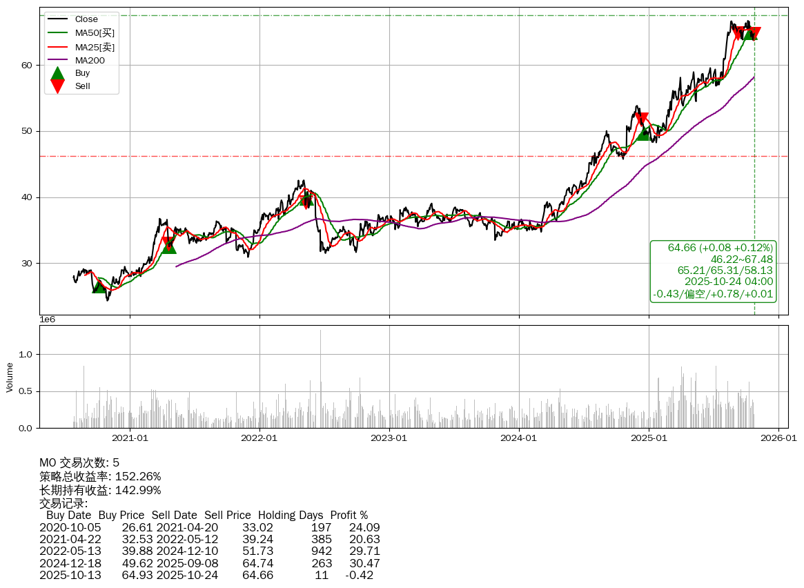 | 20 | ★MO | $64.67(+0.10 +0.15% 2025-10-24 15:59) | 📈涨破 MA10 均线 📉回撤 2025-10-08 -2.99% (16天) 63.75(2025-10-21) → 66.65(2025-10-07) (-4.35%) | +152.26% | +142.99% | +9.27% | 5 | 偏空/0.78/0.01 | 2020-07-27~2025-10-24 |