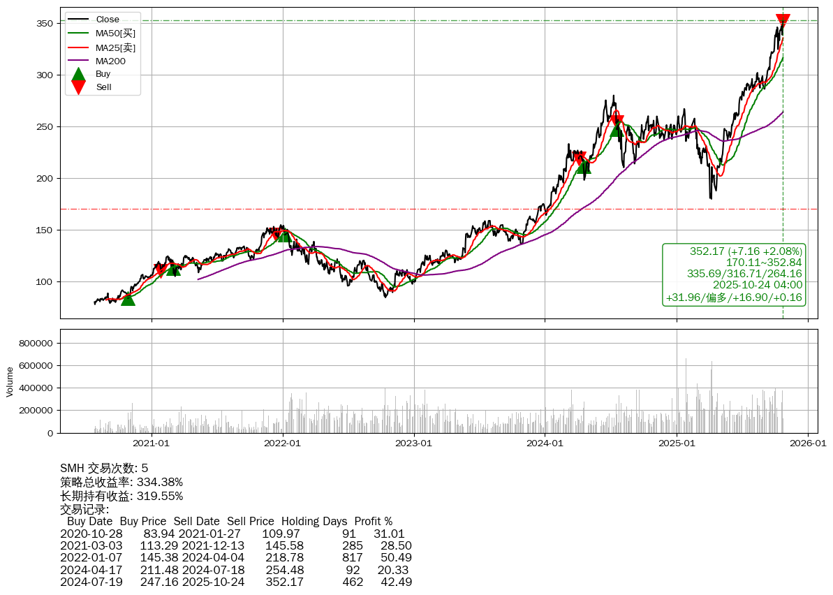 | 6 | ★SMH | $351.14(+6.08 +1.76% 2025-10-24 15:59) | 📈涨破 MA5 均线 📈涨破 52周高点 (352.84) | +334.38% | +319.55% | +14.83% | 5 | 偏多/16.9/0.16 | 2020-07-27~2025-10-24 |