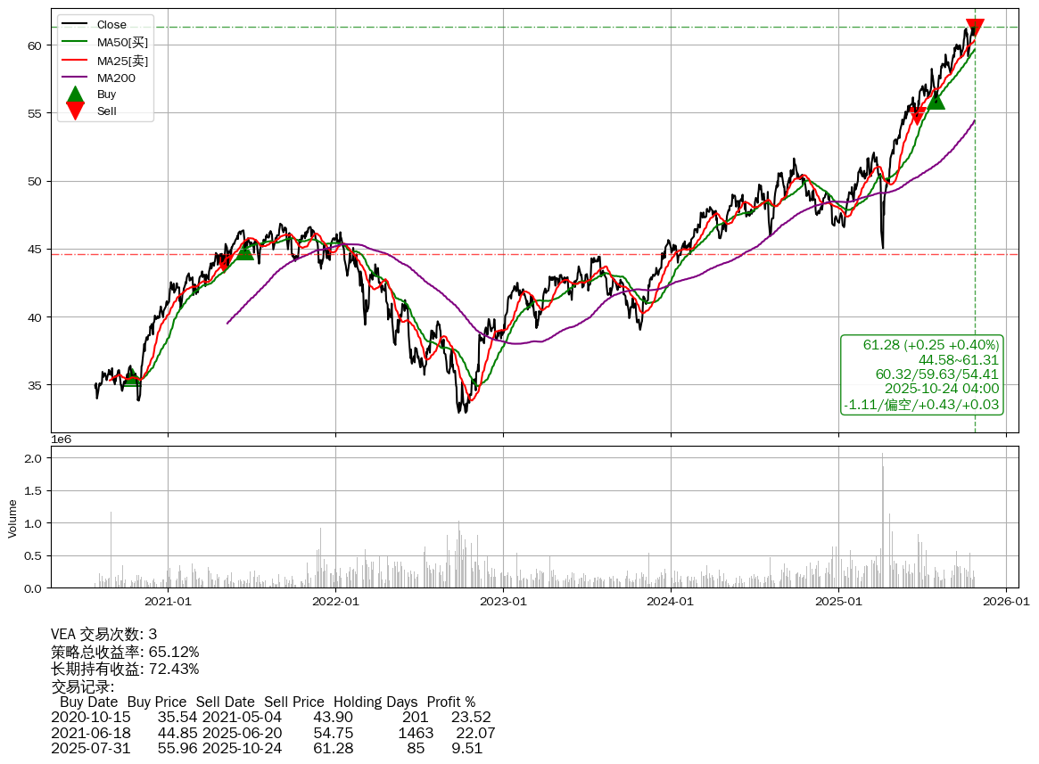 | 35 | ★VEA | $61.23(+0.19 +0.31% 2025-10-24 15:59) | +65.12% | +72.43% | -7.31% | 3 | 偏空/0.43/0.03 | 2020-07-27~2025-10-24 | |