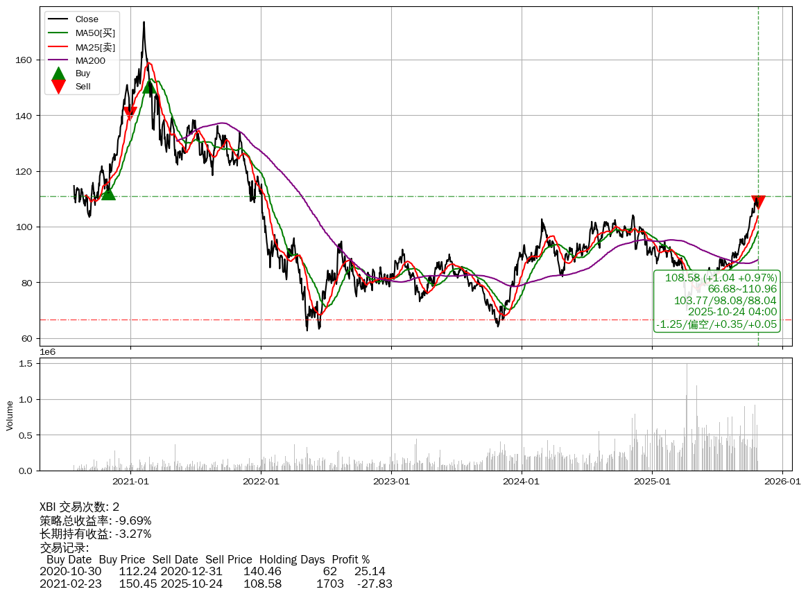 | 42 | ★XBI | $108.38(+0.83 +0.77% 2025-10-24 15:59) | 📈涨破 MA10 均线 📉回撤 2021-02-09 -37.45% (1717天) 62.59(2022-05-11) → 173.59(2021-02-08) (-63.94%) | -9.69% | -3.27% | -6.42% | 2 | 偏空/0.35/0.05 | 2020-07-27~2025-10-24 |