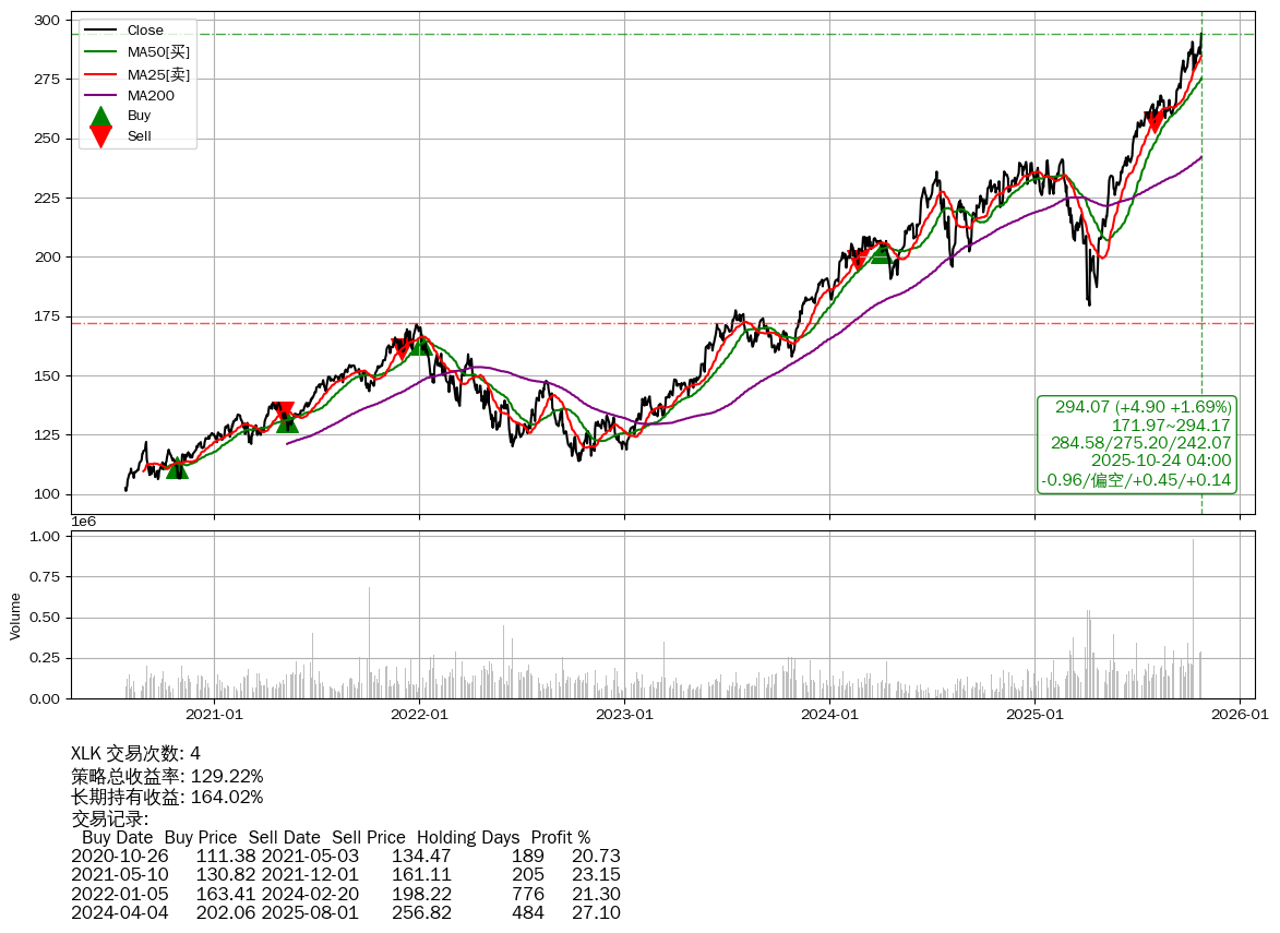 | 23 | ★XLK | $293.68(+4.65 +1.61% 2025-10-24 15:59) | 📈涨破 52周高点 (294.17) | +129.22% | +164.02% | -34.80% | 4 | 偏空/0.45/0.14 | 2020-07-27~2025-10-24 |