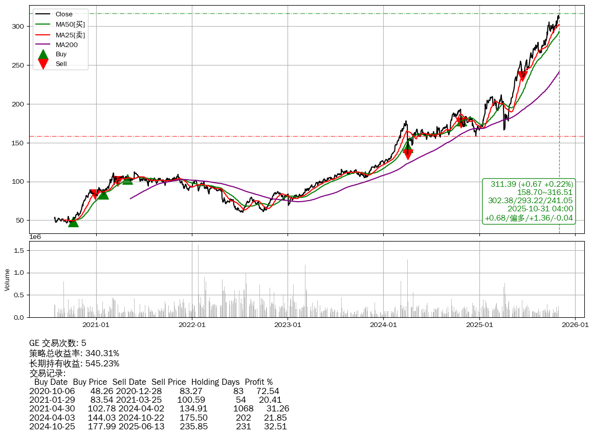 | 5 | ★GE | $308.97(-1.77 -0.57% 2025-10-31 14:59) | 📉回撤 2025-10-29 -0.84% (1天) 310.72(2025-10-29) → 314.04(2025-10-28) (-1.06%) | +340.31% | +545.23% | -204.92% | 5 | 偏多/1.33/-0.04 | 2020-07-27~2025-10-31 |