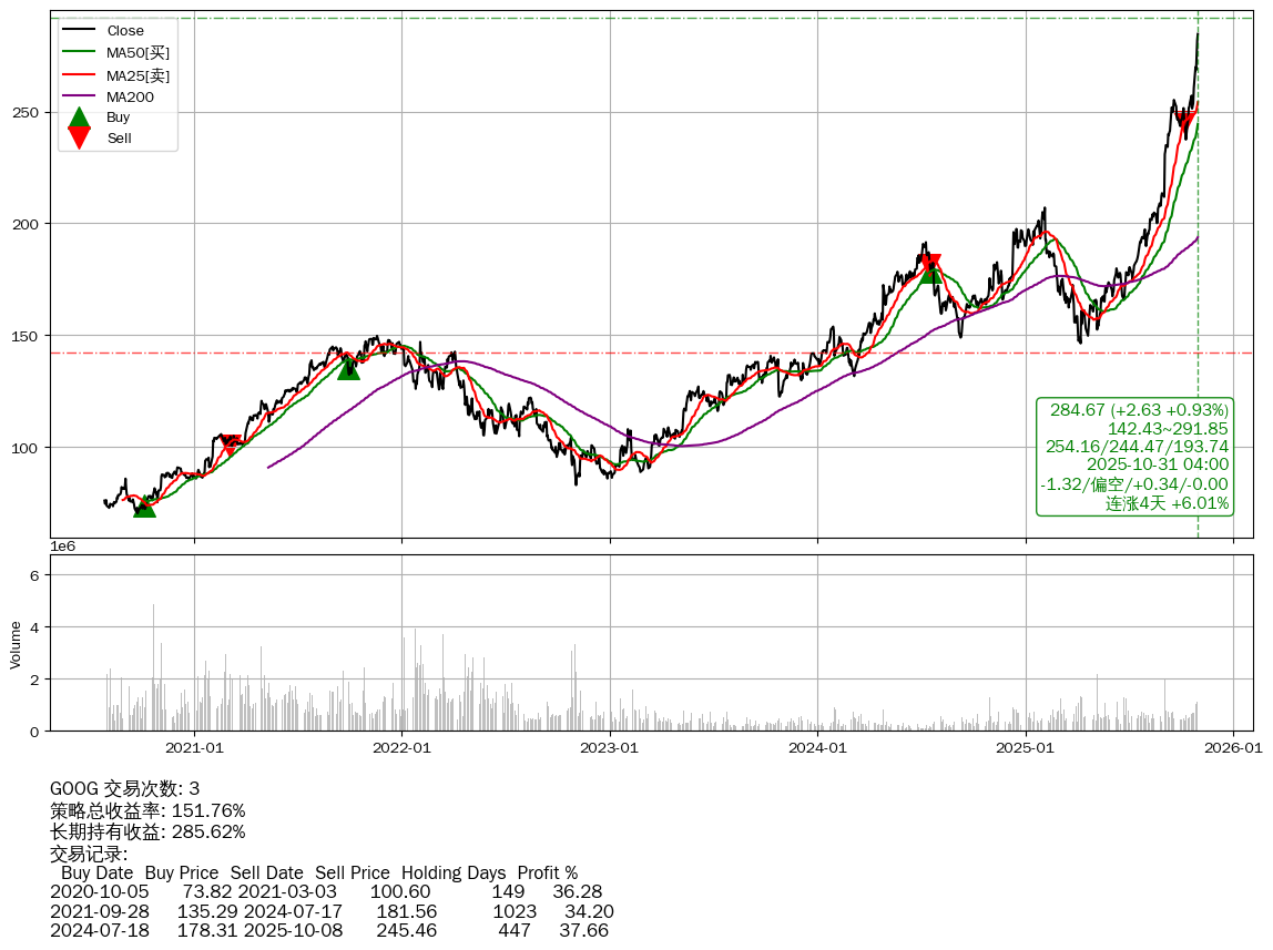 | 18 | ★GOOG | $281.92(+0.10 +0.04% 2025-10-31 14:59) | 📈连涨4天 +6.01% | +151.76% | +285.62% | -133.86% | 3 | 偏空/0.34/-0.00 | 2020-07-27~2025-10-31 |