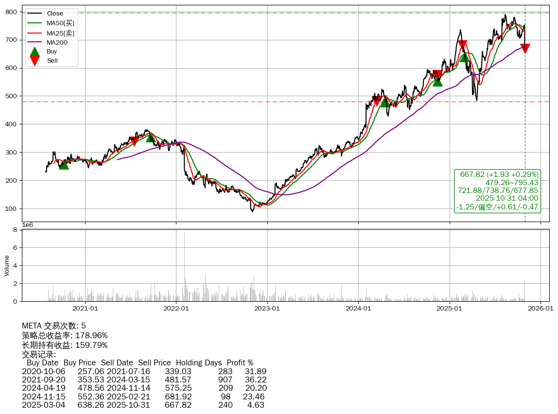 | 15 | ★META | $648.34(-17.78 -2.67% 2025-10-31 14:59) | 📉回撤 2025-08-12 -15.39% (79天) 665.89(2025-10-29) → 789.26(2025-08-11) (-15.63%) | +178.96% | +159.79% | +19.17% | 5 | 偏空/0.6/-0.47 | 2020-07-27~2025-10-31 |