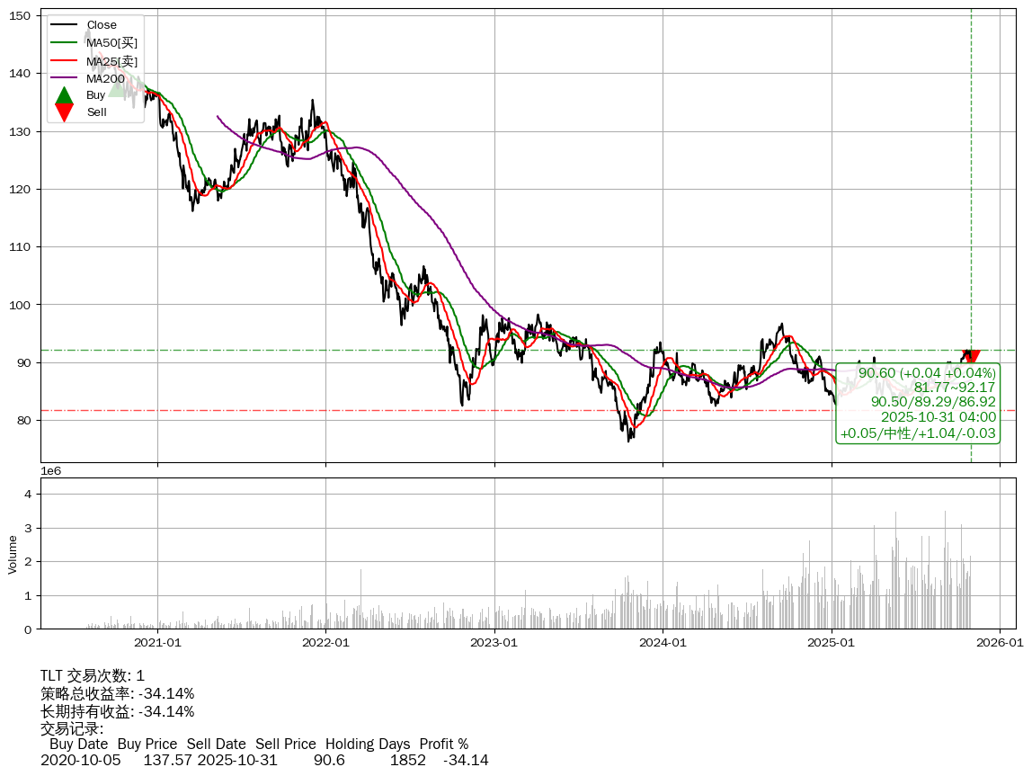 | 35 | ★TLT | $90.29(-0.28 -0.31% 2025-10-31 14:59) | 📉回撤 2020-08-04 -38.62% (1913天) 76.23(2023-10-18) → 147.61(2020-08-03) (-48.36%) | -34.14% | -34.14% | +0.00% | 1 | 中性/1.03/-0.03 | 2020-07-27~2025-10-31 |