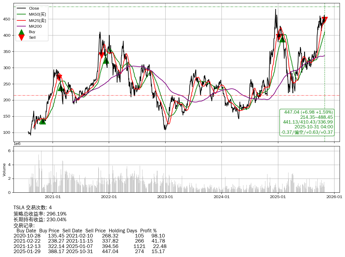 | 7 | ★TSLA | $456.54(+16.51 +3.75% 2025-10-31 14:59) | 📈涨破 MA25 均线 📉回撤 2024-12-17 -6.84% (316天) 221.89(2025-04-07) → 479.86(2024-12-16) (-53.76%) | +296.19% | +230.04% | +66.15% | 4 | 偏空/0.64/0.37 | 2020-07-27~2025-10-31 |