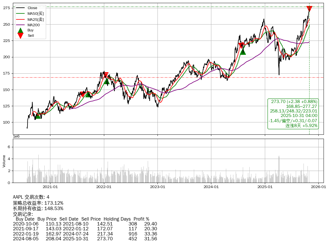 | 16 | ★AAPL | $270.25(-1.04 -0.38% 2025-10-31 14:59) | 📈涨破 52周高点 (277.27) 📈连涨8天 +5.92% | +173.12% | +148.53% | +24.59% | 4 | 偏空/0.31/-0.07 | 2020-07-27~2025-10-31 |