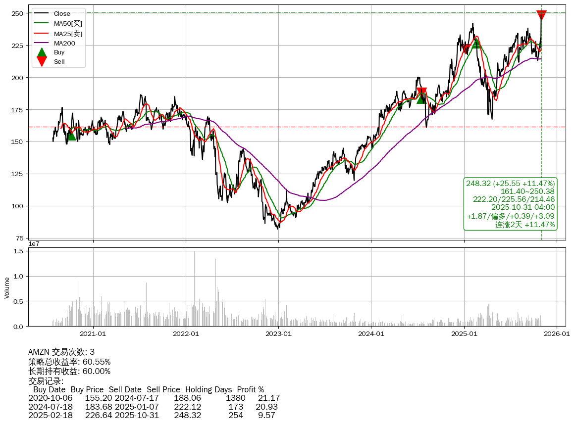 | 31 | ★AMZN | $244.22(+21.45 +9.63% 2025-10-31 14:59) | 📈涨破 MA5/10/50/100 均线 📈涨破 52周高点 (250.38) 📈连涨2天 +11.47% | +60.55% | +60.00% | +0.55% | 3 | 偏多/0.39/3.09 | 2020-07-27~2025-10-31 |