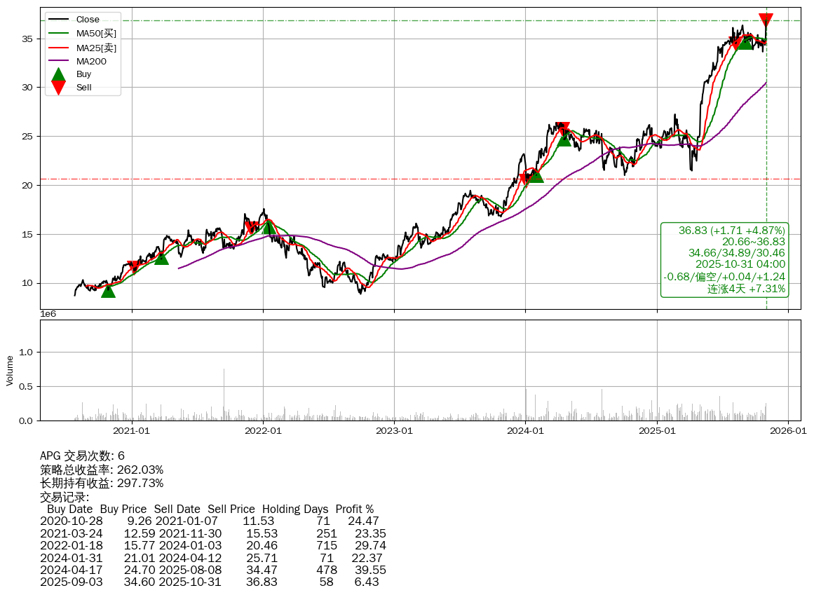 | 8 | APG | $36.83(+1.71 +4.87% 2025-10-31 14:59) | 📈涨破 52周高点 (36.83) 📈连涨4天 +7.31% | +262.03% | +297.73% | -35.70% | 6 | 偏空/0.04/1.24 | 2020-07-27~2025-10-31 |