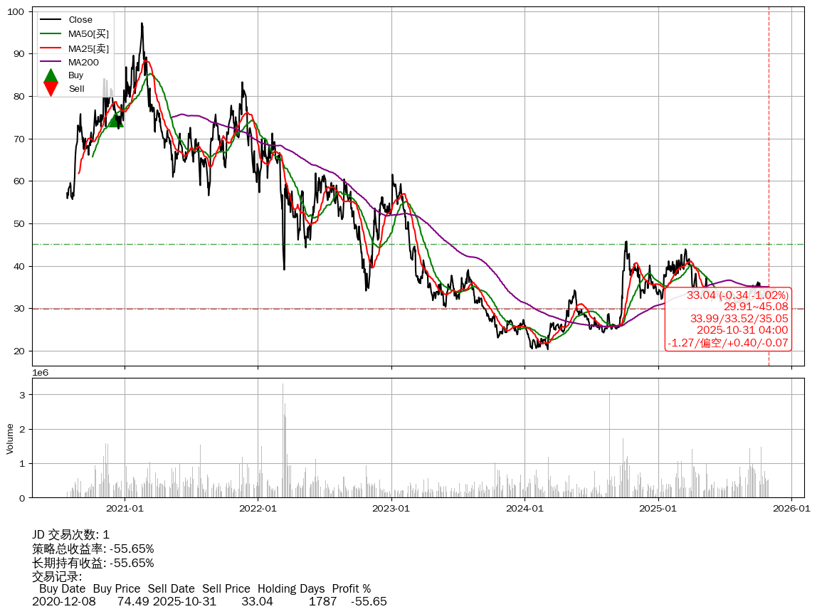 | 37 | ★JD | $33.04(-0.34 -1.02% 2025-10-31 14:59) | 📉回撤 2021-02-17 -66.01% (1715天) 20.26(2024-03-04) → 97.21(2021-02-16) (-79.16%) | -55.65% | -55.65% | -0.00% | 1 | 偏空/0.42/-0.07 | 2020-07-27~2025-10-31 |