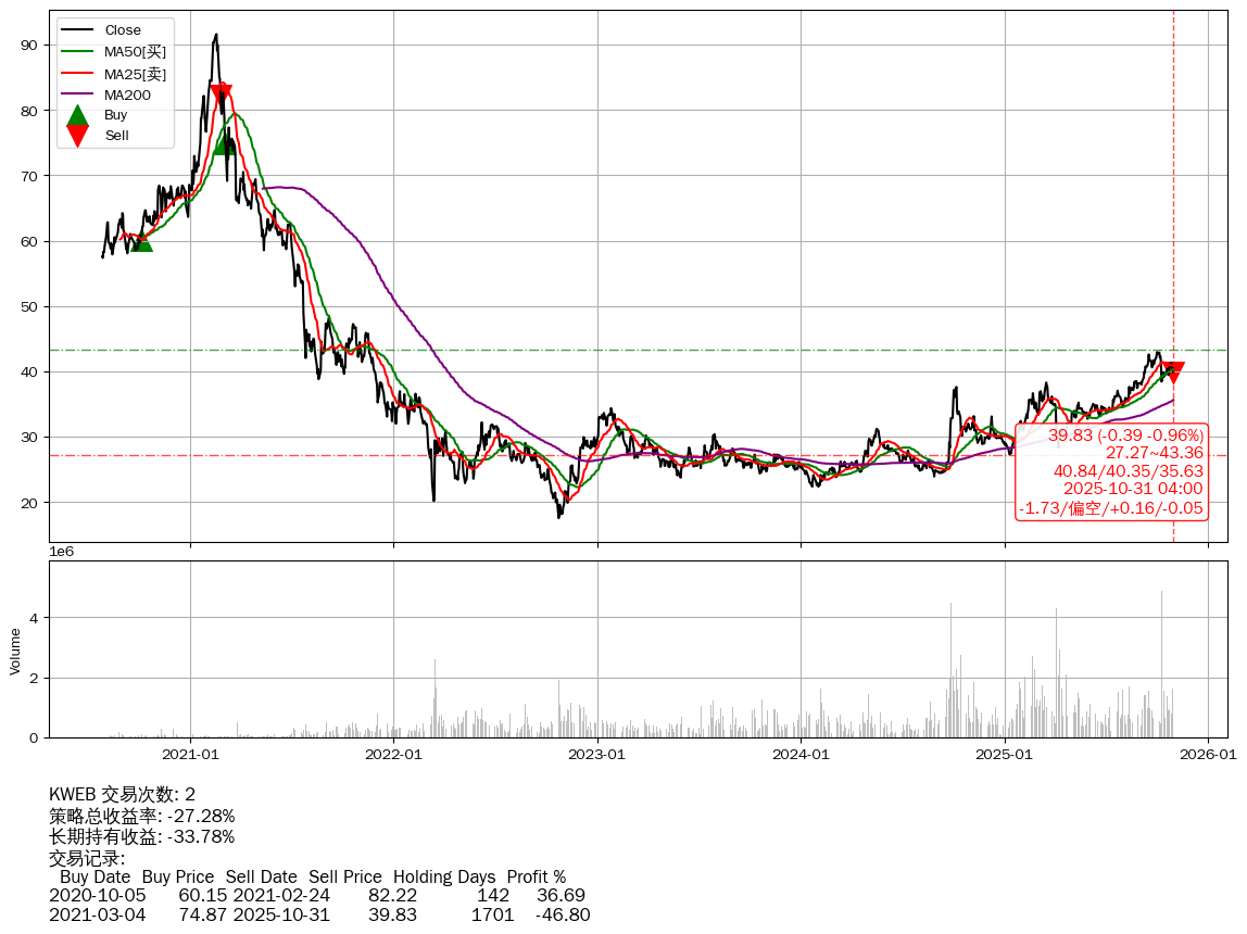 | 34 | ★KWEB | $39.96(-0.25 -0.62% 2025-10-31 14:59) | 📉回撤 2021-02-17 -56.52% (1715天) 17.53(2022-10-23) → 91.60(2021-02-16) (-80.86%) | -27.28% | -33.78% | +6.50% | 2 | 偏空/0.16/-0.05 | 2020-07-27~2025-10-31 |