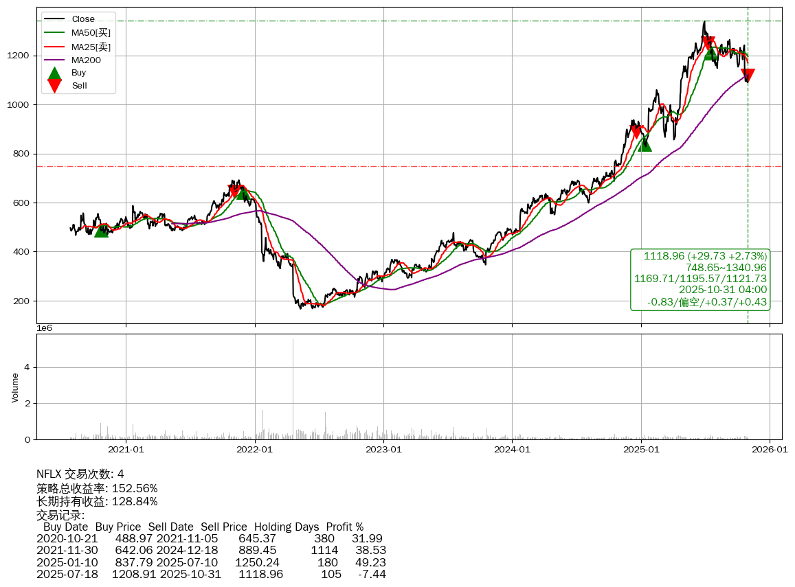 | 17 | NFLX | $1118.86(+29.93 +2.75% 2025-10-31 14:59) | 📈涨破 MA5 均线 📉回撤 2025-06-30 -16.45% (122天) 1089.23(2025-10-29) → 1339.23(2025-06-29) (-18.67%) | +152.56% | +128.84% | +23.72% | 4 | 偏空/0.37/0.43 | 2020-07-27~2025-10-31 |