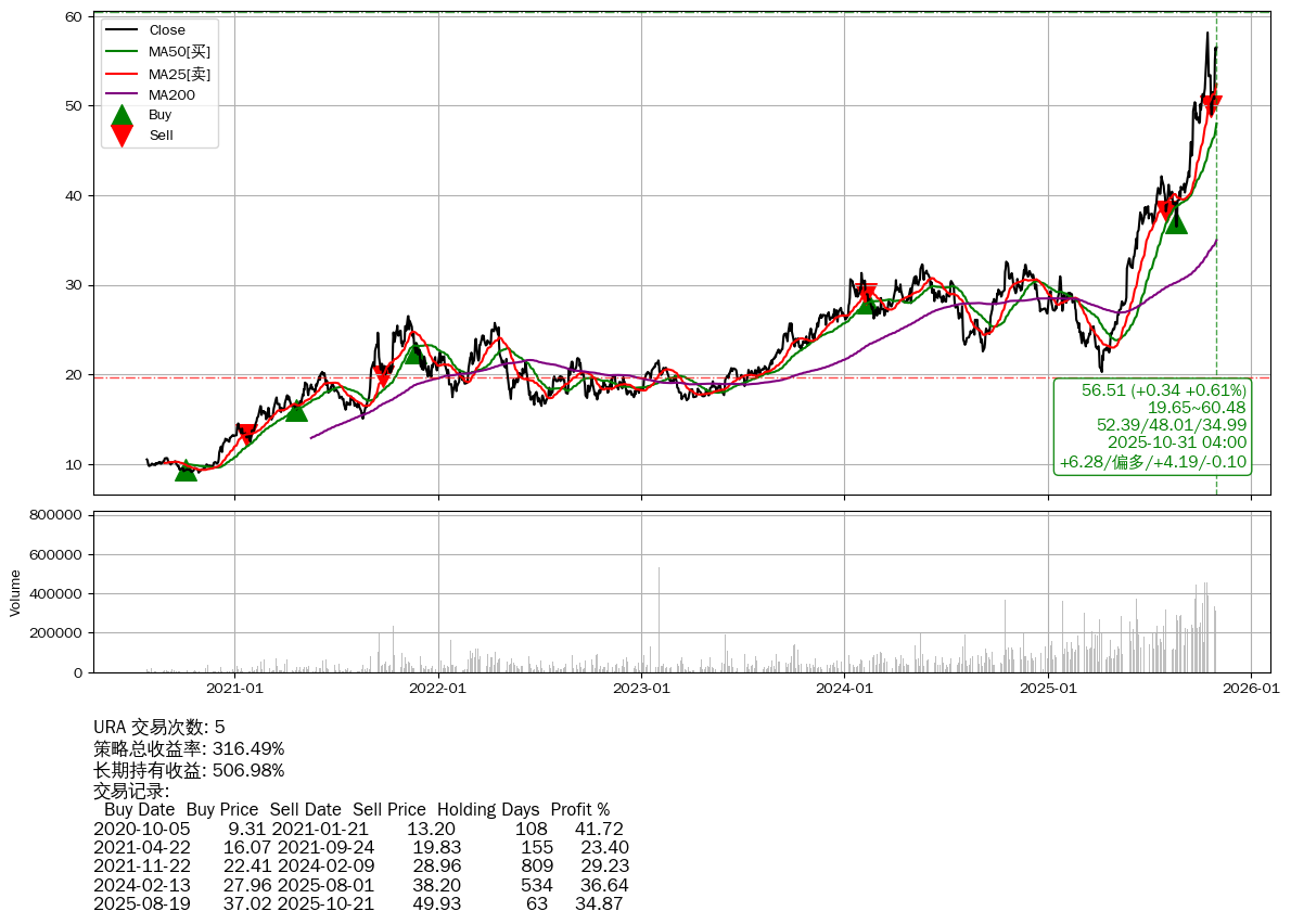 | 6 | ★URA | $55.11(-1.07 -1.90% 2025-10-31 14:59) | 📉回撤 2025-10-15 -2.85% (15天) 49.02(2025-10-21) → 58.17(2025-10-14) (-15.73%) | +316.49% | +506.98% | -190.49% | 5 | 偏多/4.19/-0.10 | 2020-07-27~2025-10-31 |