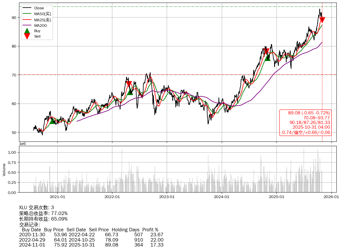 | 28 | ★XLU | $89.08(-0.65 -0.72% 2025-10-31 14:59) | 📉回撤 2025-10-15 -4.09% (15天) 89.08(2025-10-30) → 92.88(2025-10-14) (-4.09%) | +77.02% | +65.09% | +11.94% | 3 | 偏空/0.66/-0.06 | 2020-07-27~2025-10-31 |