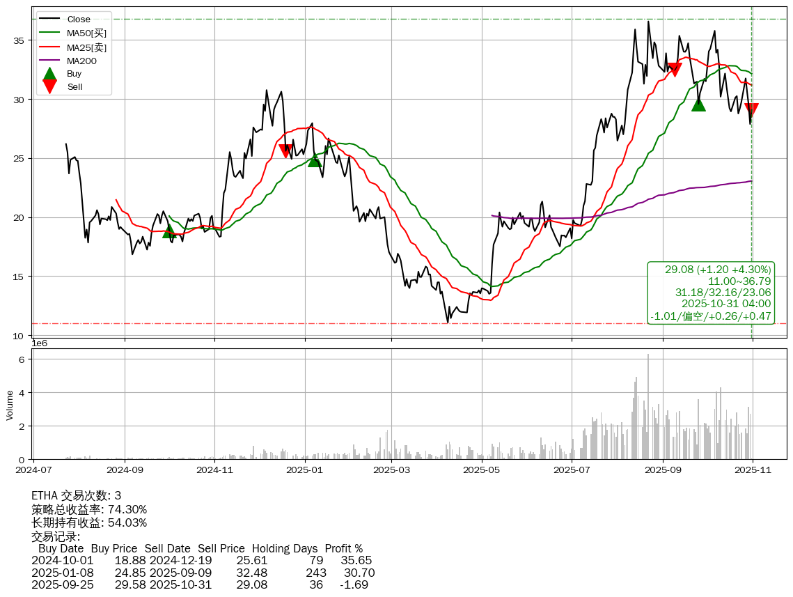 | 31 | ★ETHA | $29.36(+1.51 +5.42% 2025-10-31 14:59) | 📈涨破 MA100 均线 📉回撤 2025-08-24 -20.50% (67天) 27.88(2025-10-29) → 36.58(2025-08-21) (-23.78%) | +74.30% | +54.03% | +20.27% | 3 | 偏空/0.26/0.47 | 2024-07-23~2025-10-31 |